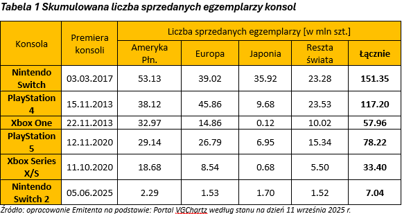 Drugim co do wielkości segmentem globalnego rynku gier są konsole. Według szacunków Newzoo w 2024 r. przychody z tego segmentu wyniosły ok. 43,8 mld USD, co oznacza spadek o ok. 1% r/r. Analitycy prognozują jednak, że kolejne lata przyniosą wyraźne odbicie – w 2025 r. rynek konsol ma urosnąć o 5,5% r/r, a największą dynamikę wzrostu odnotuje region Azji i Pacyfiku, napędzany przede wszystkim przez Japonię. Wysoki wzrost, na poziomie 5,4% r/r, spodziewany jest także w Ameryce Północnej. Na poprawę wyników segmentu wpływa kilka czynników. Jednym z nich jest premiera Nintendo Switch 2 z 5 czerwca 2025 r., która stanowi impuls do wzrostu przychodów po okresie spowolnienia w późnym cyklu życia poprzedniej generacji konsoli. Dodatkowo znaczenie mają rosnące ceny oprogramowania, sprzyjające zwiększeniu wartości sprzedaży. Wsparciem dla wyników będą także duże premiery gier zaplanowane na 2025 r.[2] Najsilniejszy wzrost prognozowany jest w regionach, w których Switch cieszył się szczególną popularnością, zwłaszcza we wschodniej Azji i we Francji. Według danych na dzień 11.09.2025 r. łączna skumulowana sprzedaż konsol PlayStation 5, Xbox Series S/X, Nintendo Switch i Nintendo Switch 2 ma wynosić 270,01 mln.