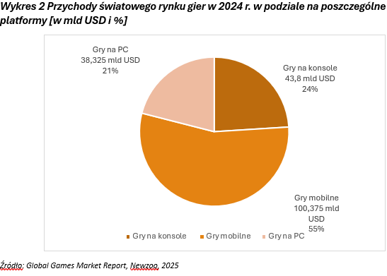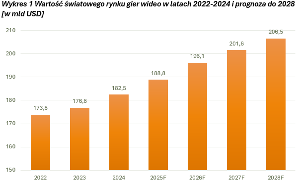 Według analityków firmy badawczej Newzoo, światowy rynek gier w 2024 r. wygenerował przychody w wysokości 182,5 mld USD, co oznaczało wzrost sektora o 3,2% r/r. Głównymi czynnikami wzrostu był dynamiczny rozwój segmentu mobilnego w regionach, gdzie urządzenia przenośne pozostają dominującą platformą – zwłaszcza w Ameryce Łacińskiej, na Bliskim Wschodzie i w Afryce. Dodatkowe wsparcie zapewniła stabilna sprzedaż gier i usług cyfrowych w Ameryce Północnej oraz Europie, a także premiery nowych tytułów i skuteczniejsza monetyzacja istniejącej bazy graczy. Z prognoz Newzoo wynika, że do 2028 r. przychody branży wzrosną do 206,5 mld USD, przy skumulowanym rocznym wskaźniku wzrostu (ang: compound annual growth rate, CAGR) na poziomie ok. 3,1% w latach 2024–2028. Oznacza to, że rynek gier będzie rozwijał się szybciej niż w latach 2022–2024, kiedy CAGR wyniósł 2,5%. Analitycy podkreślają jednak, że globalny sektor wchodzi w fazę dojrzałości, w której coraz większego znaczenia nabiera retencja graczy oraz innowacyjne formy monetyzacji.