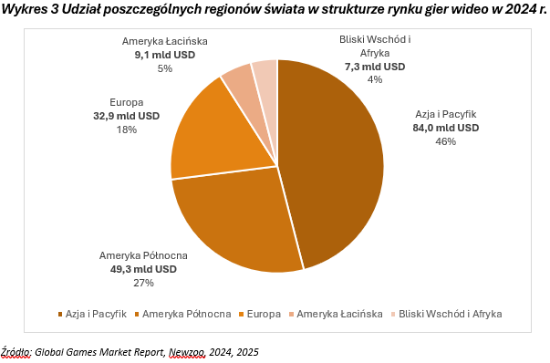 Według Analityków firmy Newzoo w 2025 r. globalny rynek gier ma rosnąć w zróżnicowanym tempie w poszczególnych regionach. W rejonie Azji i Pacyfiku przewiduje się, że przychody zwiększą się o ok. 2,3% r/r, przy czym lokalne niuanse sprawiają, że dynamika wzrostu będzie nierówna. W Ameryce Północnej rynek urośnie o ok. 4,2% r/r, wspierany m.in. przez stabilny segment konsol. W Europie tempo wzrostu wyniesie ok. 3,6% r/r, jednak ograniczenia demograficzne, takie jak starzenie się społeczeństwa i niższy przyrost populacji, będą hamowały dalszy rozwój. Najdynamiczniej rozwijać się będą młodsze rynki. Ameryka Łacińska zanotuje wzrost o ok. 6,4% r/r dzięki szybkiemu przyrostowi liczby graczy na wszystkich platformach, mimo że konsole pozostaną w tyle. Jeszcze wyższe tempo wzrostu, na poziomie ok. 7,5% r/r, odnotuje Bliski Wschód i Afryka, gdzie szczególnie segment mobilny stanie się głównym motorem napędowym. Jest to efektem dynamicznego rozwoju chińskich producentów OEM (ang: Original Equipment Manufacturer), takich jak Xiaomi i Realme, którzy wykorzystują przystępność cenową, lokalną produkcję oraz nasycenie rynku detalicznego.