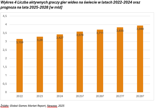Jak podaje firma Newzoo, na koniec 2024 r. na świecie było około 3,427 mld aktywnych graczy, z czego najwięcej z nich stanowili niezmiennie gracze mobile. Według prognoz analityków w 2025 r. liczba ta wzrośnie o ok. 4,4% do 3,578 mld graczy, z czego gracze mobilni będą stanowili ok. 83% – 2,985 mld. Na drugim miejscu znajdą się gracze segmentu gier komputerowych w liczbie 0,936 mld (26%), a aktywnych graczy konsolowych w 2025 r. będzie ok. 0,645 mld. Zgodnie z prognozami specjalistów z Newzoo do końca 2028 r. liczba graczy wzrośnie do 3,948 mld, co oznacza wzrost w porównaniu do 2022 roku o ok. 25%. Skumulowany roczny wskaźnik wzrostu (ang: compound annual growth rate, CAGR) w latach 2024–2028 wynieść ma ok. 3,60%. Według Newzoo najwięcej graczy na koniec 2025 r. będzie pochodziło z Azji (ok. 53%). Na kolejnych miejscach znajdzie się region Bliskiego Wschodu i Afryki (ok. 16%), a następnie Europa (ok. 13%), Ameryka Łacińska (ok. 11%) i Ameryka Północna (ok. 7%). Oczekuje się, że całkowita liczba graczy w 2025 r. będzie stanowiła 61,5% populacji online, która ma wzrosnąć o 3,8% r/r do 5,8 mld. Oznacza to, że większość światowej populacji z dostępem do Internetu będzie grać w gry na co najmniej jednej platformie, przy czym większość z nich na urządzeniach mobilnych. Prognozy wskazują, że udział graczy w stosunku do populacji online w latach 2025–2028 pozostanie stabilny, co potwierdza dojrzałość rynku gier i konieczność monetyzacji istniejącej bazy odbiorców.
